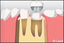 - les couronnes de substitution, ou dents à pivot, qui interviennent lorsque la destruction de la couronne naturelle de la dent est totale, et nécessite d’utiliser le canal radiculaire pour y placer un tenon (ou pivot).